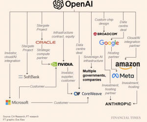 Now, I’m reading about new ways to finance the AI boom and, again, the risks keep coming back to a very narrow collateral pool. The word “circular” is back and one name keeps cropping up; OpenAI. My newsfeed has been bombarded with multiple graphics from Bloomberg, Goldman Sachs and The Financial Times (see below) illustrating this circularity accompanied by headlines stating that OpenAI is at the centre of a $1 trillion AI infrastructure spending boom. And, I thought they were just building a chatbot (ChatGPT).