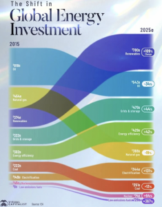 The most recent cancellation was a biggie in Rhode Island. An off-shore wind project 80% completed by Danish company, Ørsted, was halted by the Department of the Interior citing “concerns related to the protection of national security interests”.  That project would have powered 350,000 homes in Connecticut and Rhode Island. Meanwhile, the rest of the world is rapidly shifting focus away from fossil fuel projects. The graphic below is from the Visual Capitalist team using IEA data and compares global investment from the years 2015 and 2025 (estimated). Renewable energy investment projects have more than doubled to $780 billion and overtaken oil project investment which has shrunk from over $800 billion to $543 billion. Interestingly, electricity grid, storage and efficiency projects are now forecast to reach close to $800 billion in 2025.